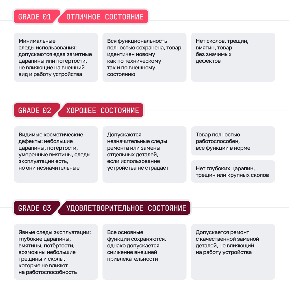 Grade 1 (отличное состояние)- Минимальные следы использования: допускаются едва заметные царапины или потертости, не влияющие на внешний вид и работу устройства.